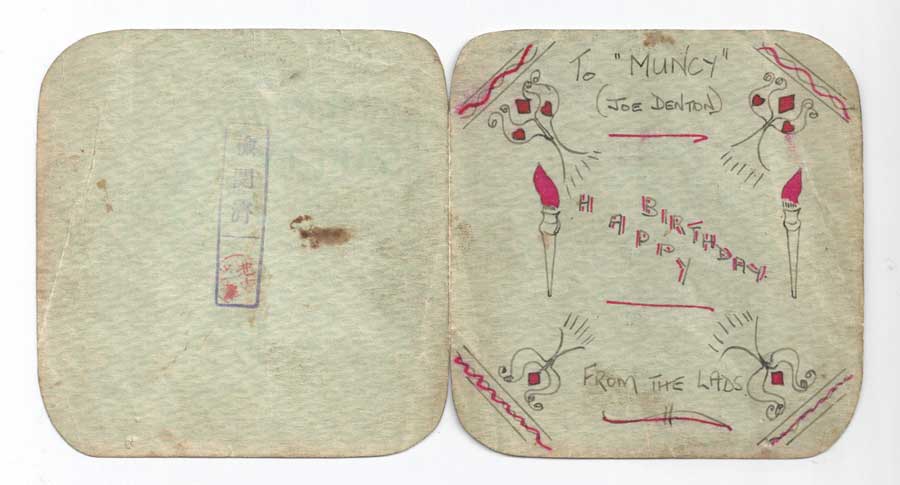 While Charles was a POW in Kobe House he was part of a group of prisoners calling themselves the Mad Gang, who performed concerts and shows. The group had been started by Joe Denton, another survivor of the Lisbon Maru. Although the group had the support of some of the guards, one guard took offence and Joe Denton received a beating. Whilst he was in hospital recovering, the others made him a birthday card out of scrap paper and signed it. The nine signatories were all survivors of the Lisbon Maru.